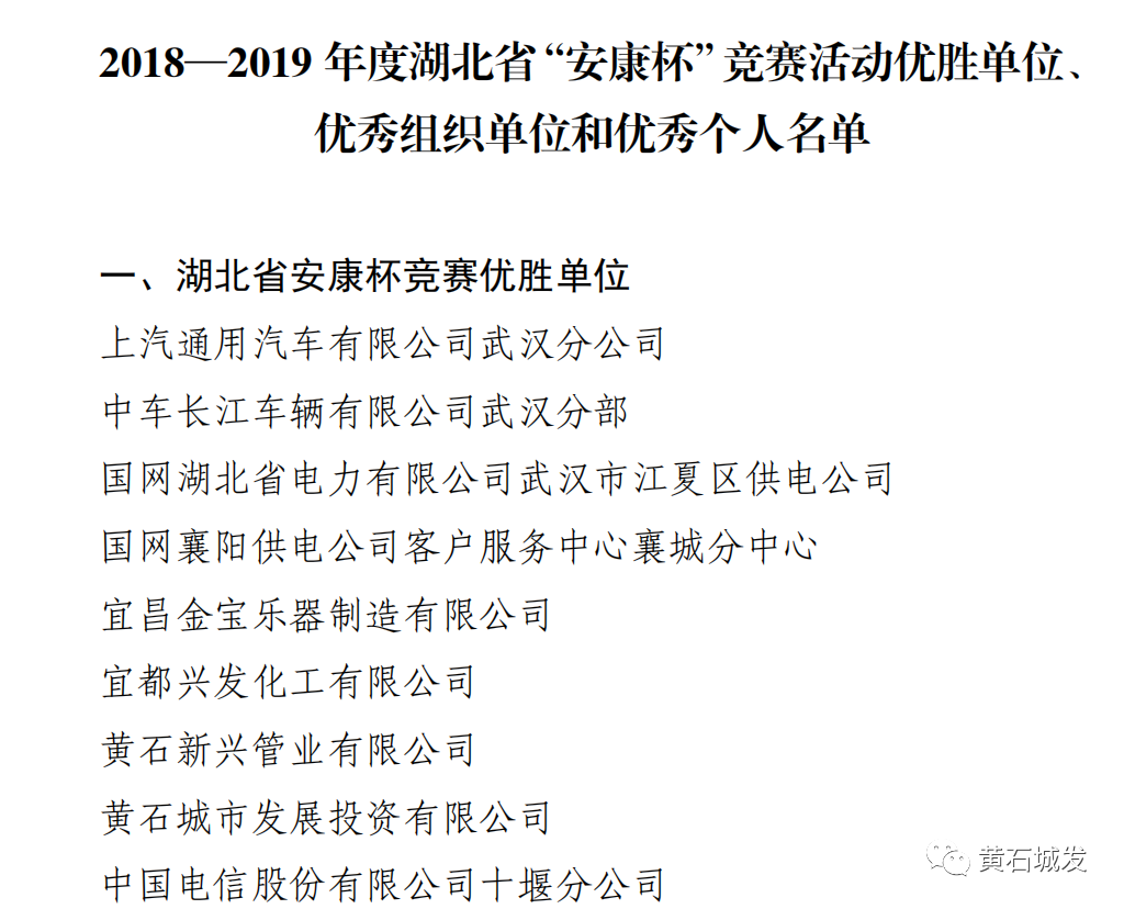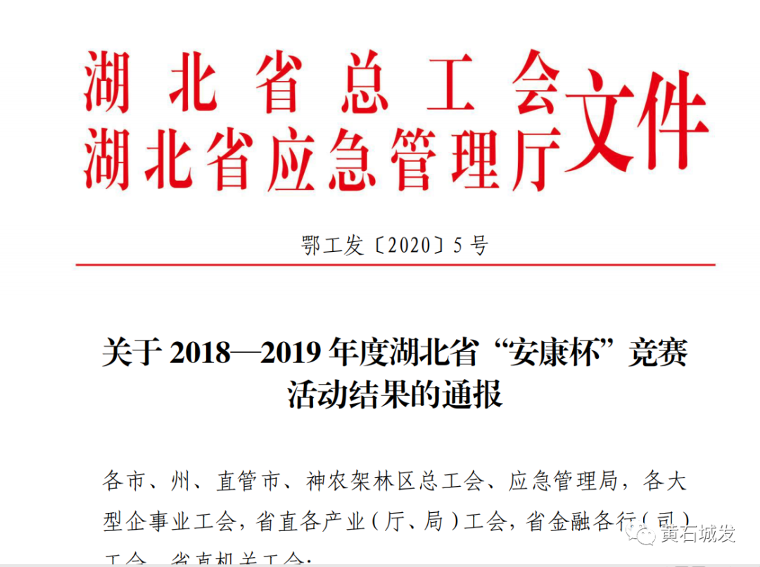 近日從湖北省總工會(huì)、湖北省應(yīng)急管理廳獲悉2018—2019年度湖北省“安康杯”競(jìng)賽活動(dòng)結(jié)果揭曉黃石市城市發(fā)展投資集團(tuán)有限公司獲評(píng)“湖北省安康杯競(jìng)賽優(yōu)勝位”